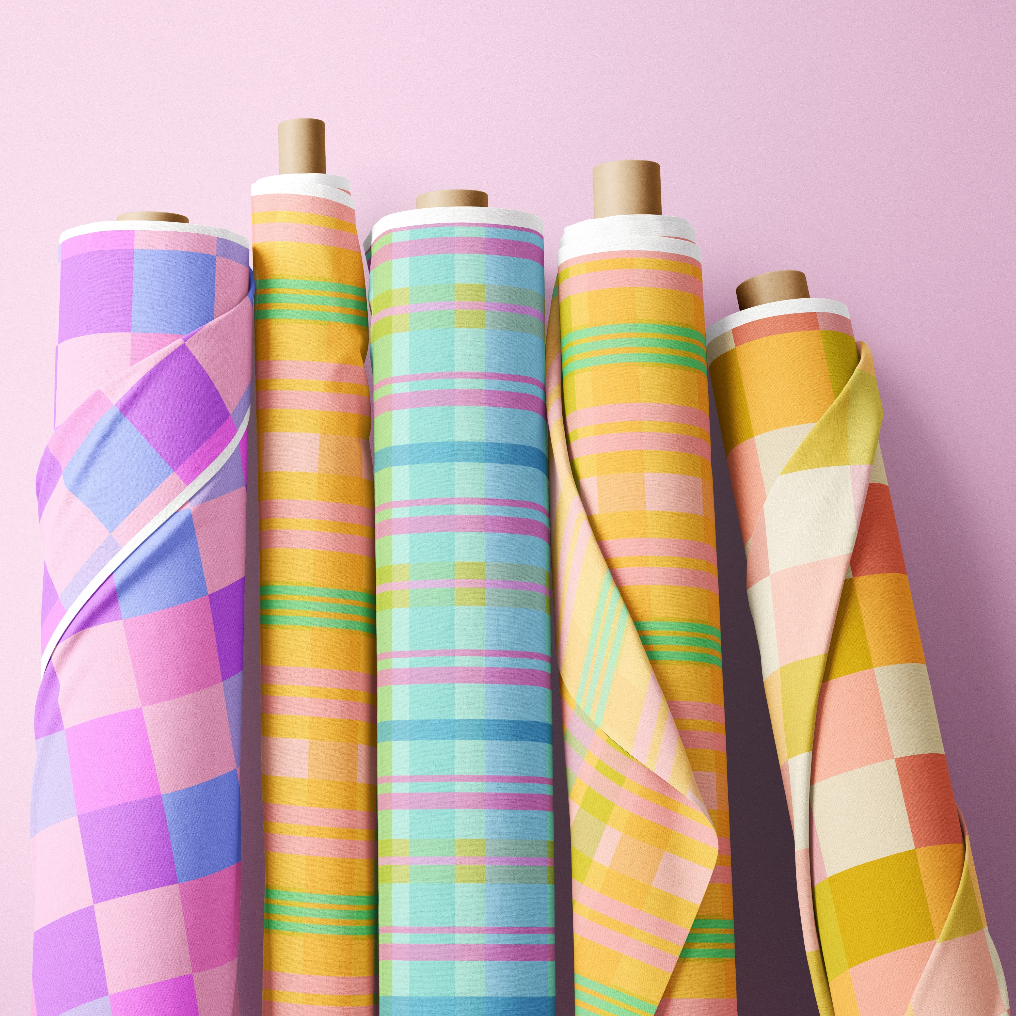 One of our in-house designed plaid prints with superbly warm yellow tones and mixed turquois, blue and green! A real delight! Linen cotton and light apparel await!