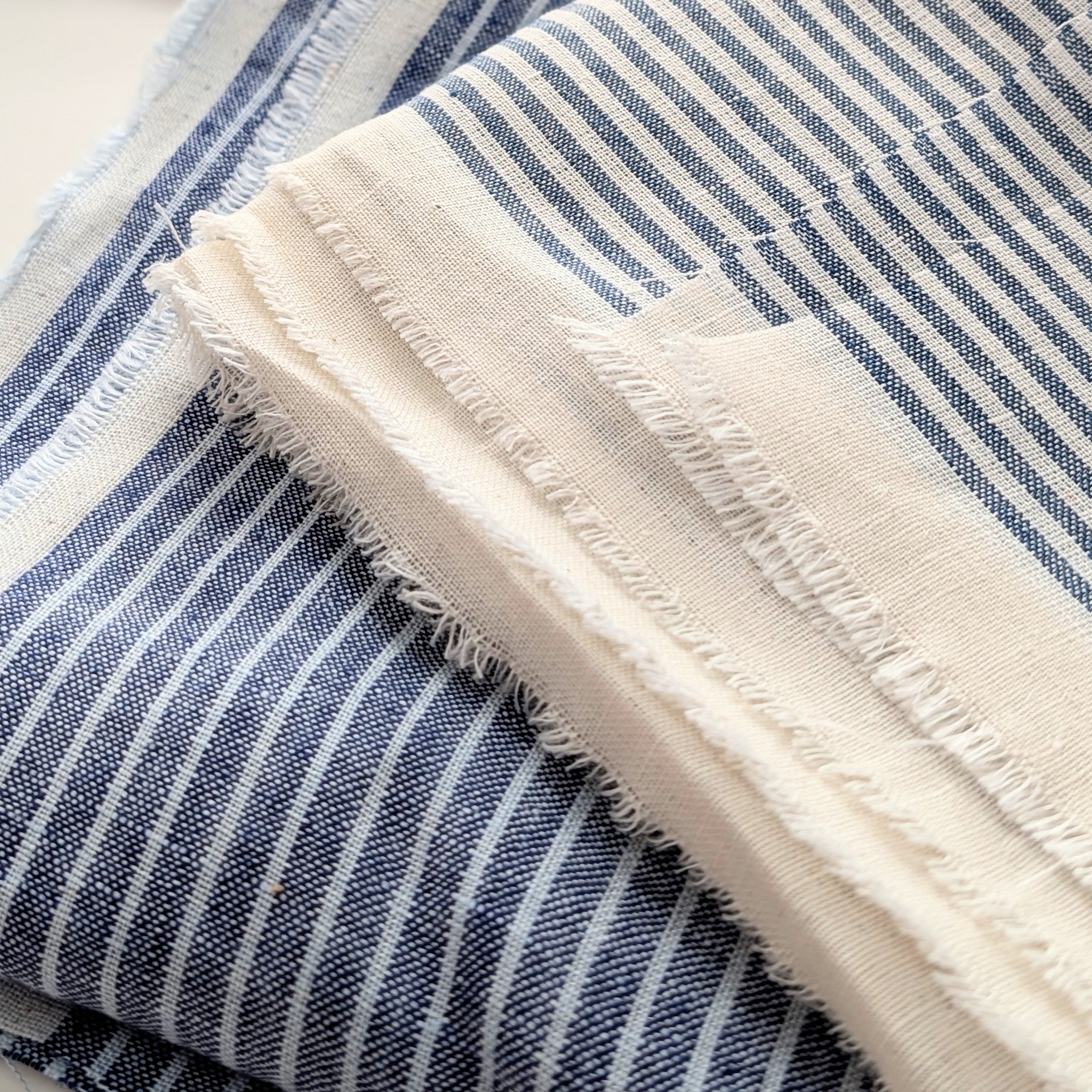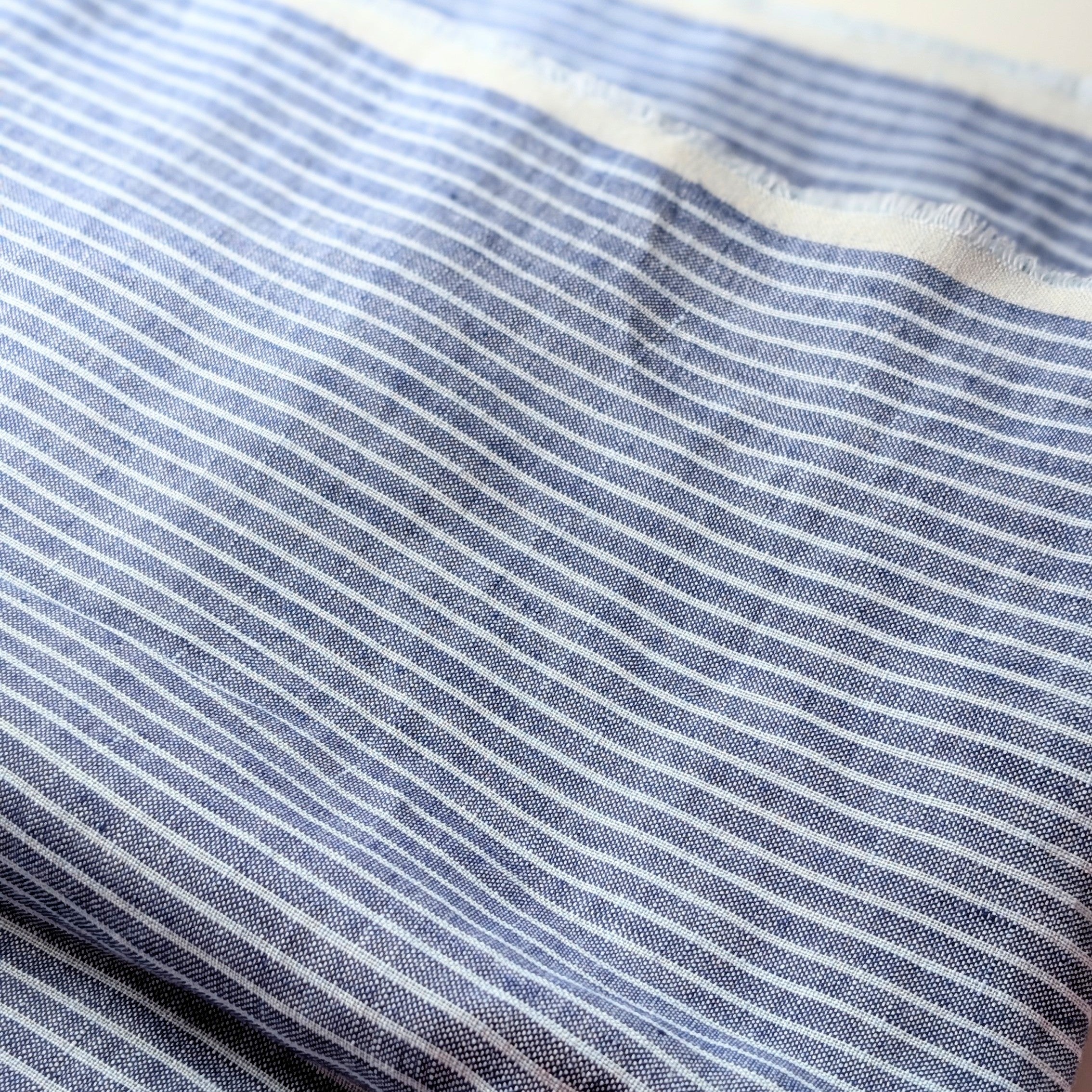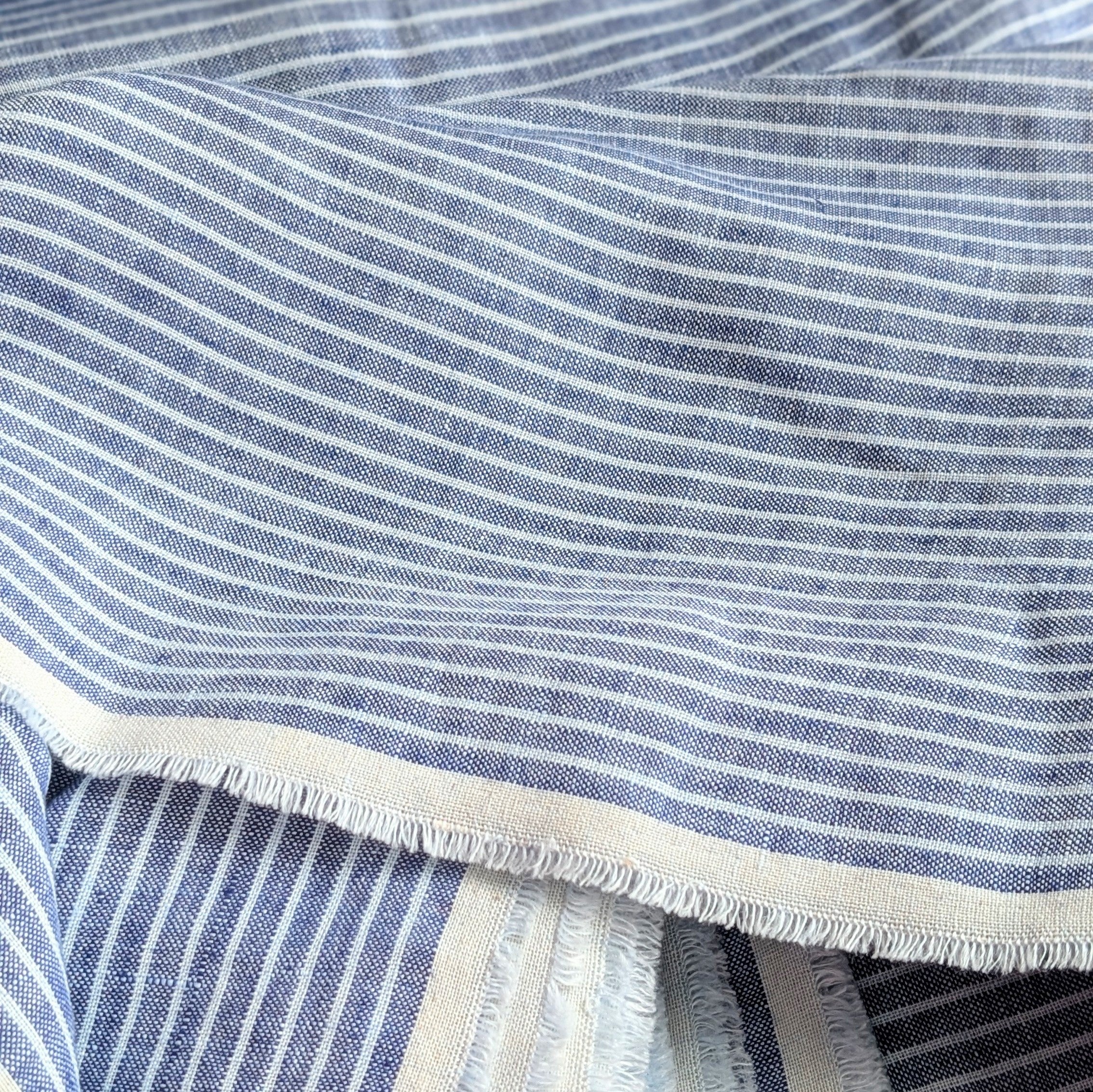 A vintage style blue striped linen that is full of the nostalgic charm of country houses! 100% Pure Certified European Grown and Milled Flax Linen. Lovely lightweight, highly textural linen, pre-washed with a gorgeous feel. A premium linen suitable for apparel and homewares.