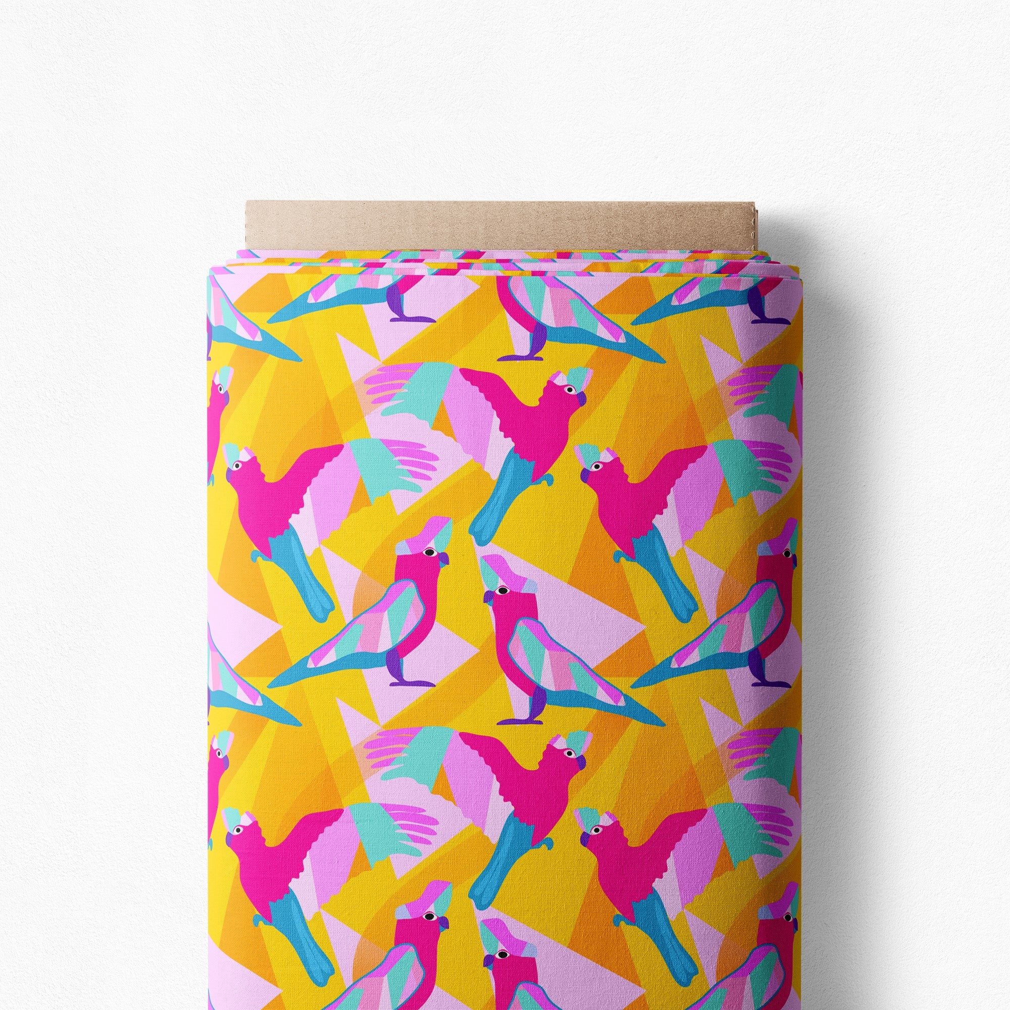 A glorious, flock of geometric patterned galahs! Inspired by those cheeky birds we see getting around suburbia and dancing on lightpoles! It can be a disco dance now! Available in a yellow or pink base. ❤