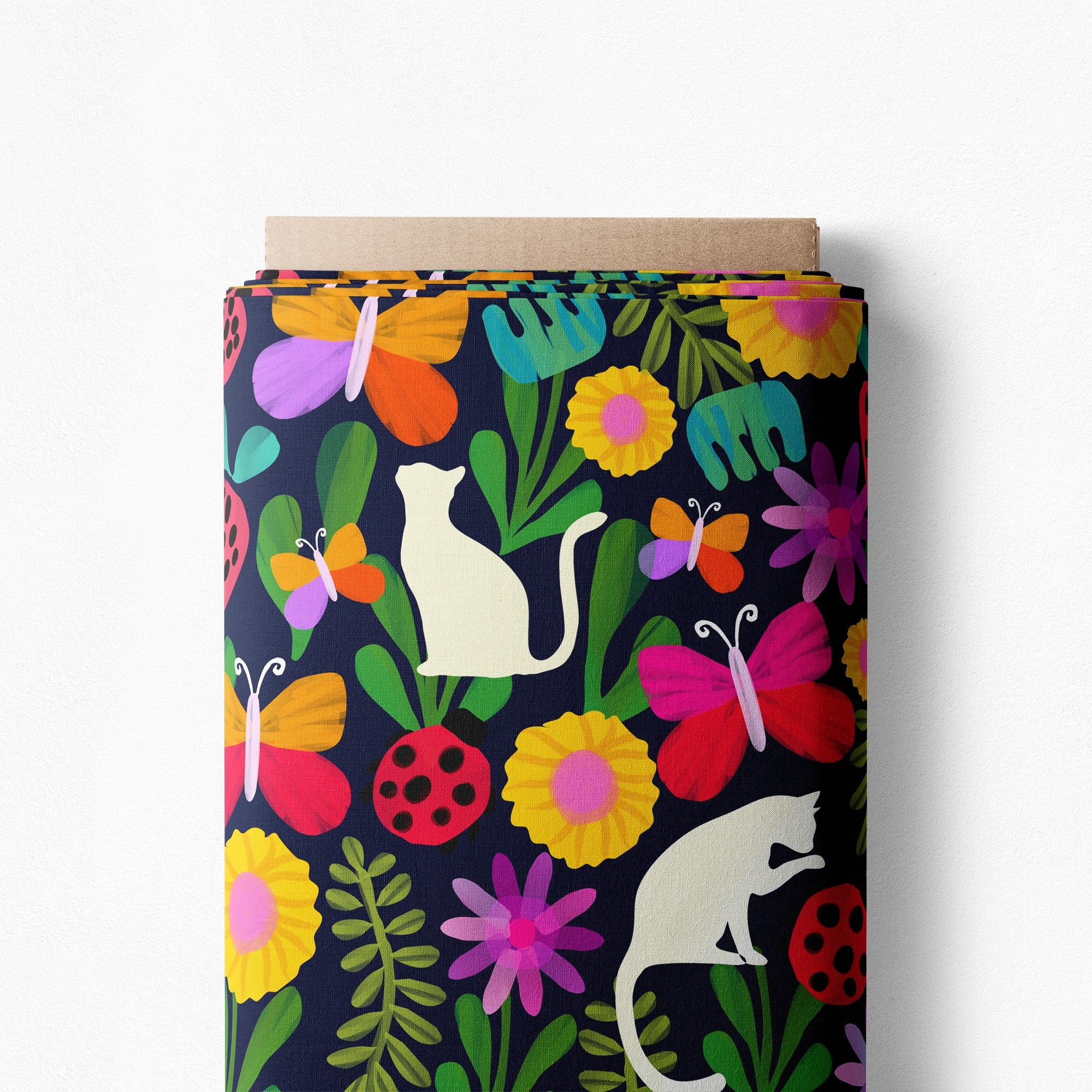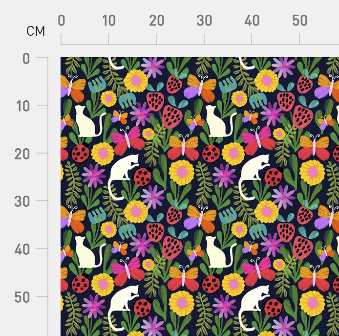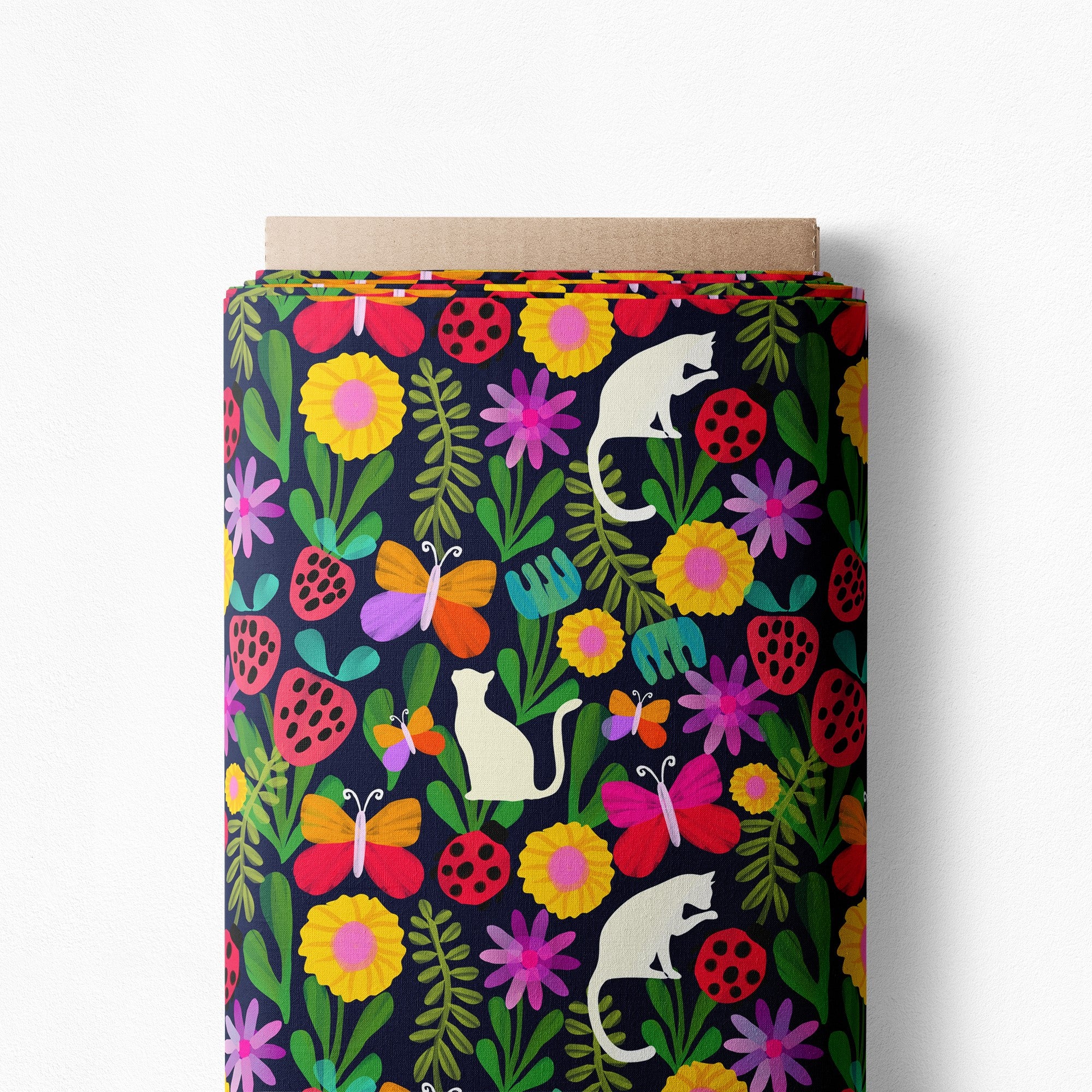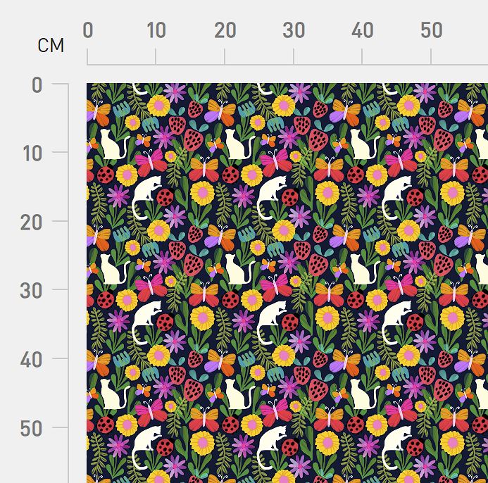 Lovable, painterly and highly floral, this kitty cat strawberry patch is just charming! Butterflies dance around painted green foliage with ladybirds and berries, the little cats will capture your heart ❤