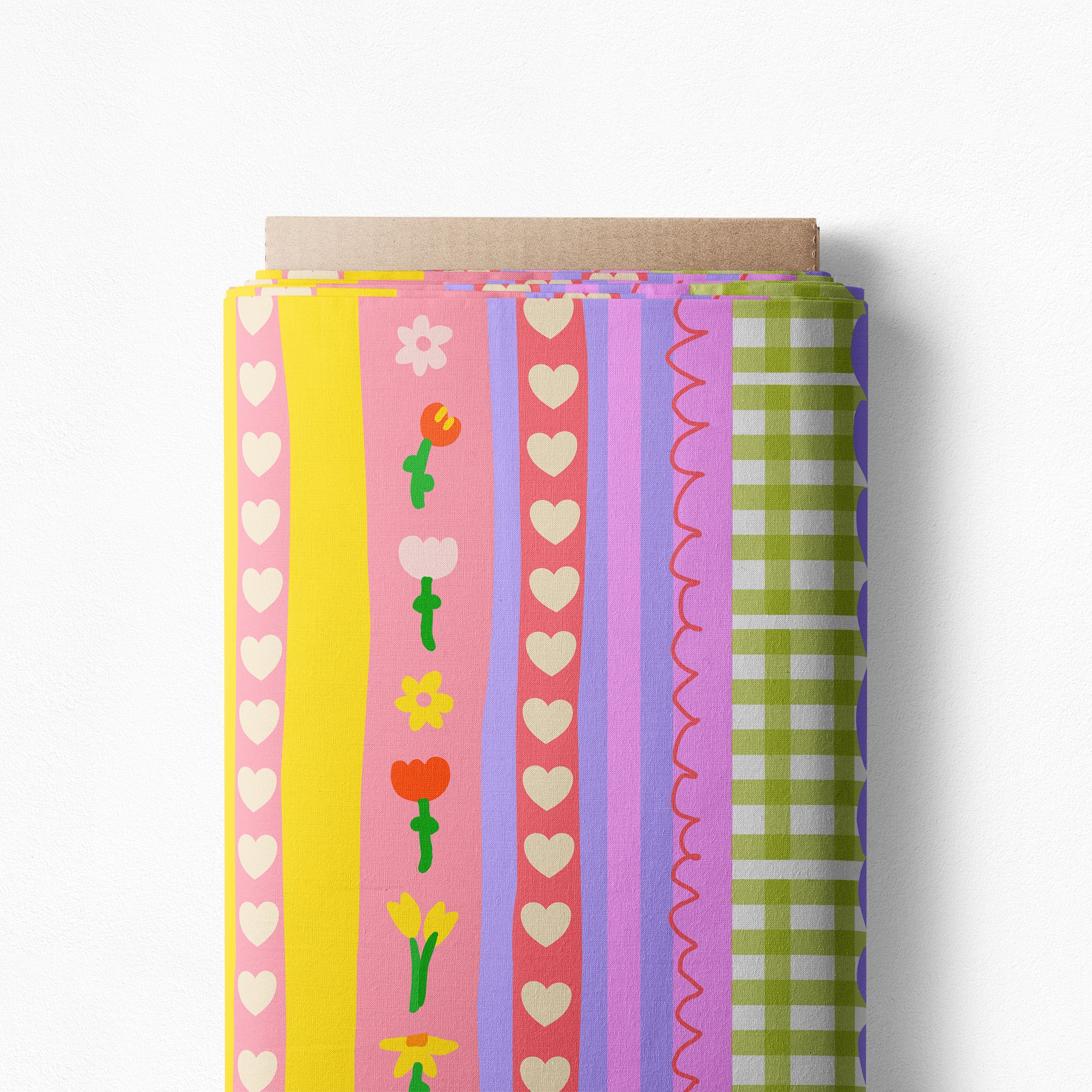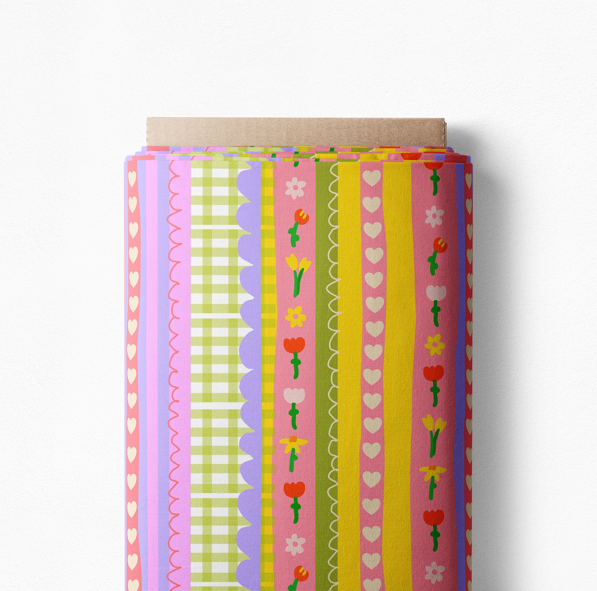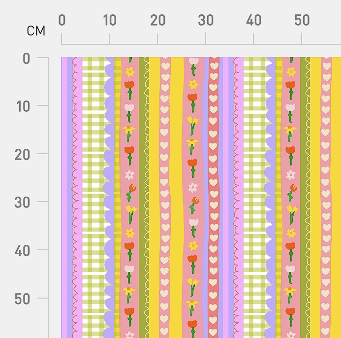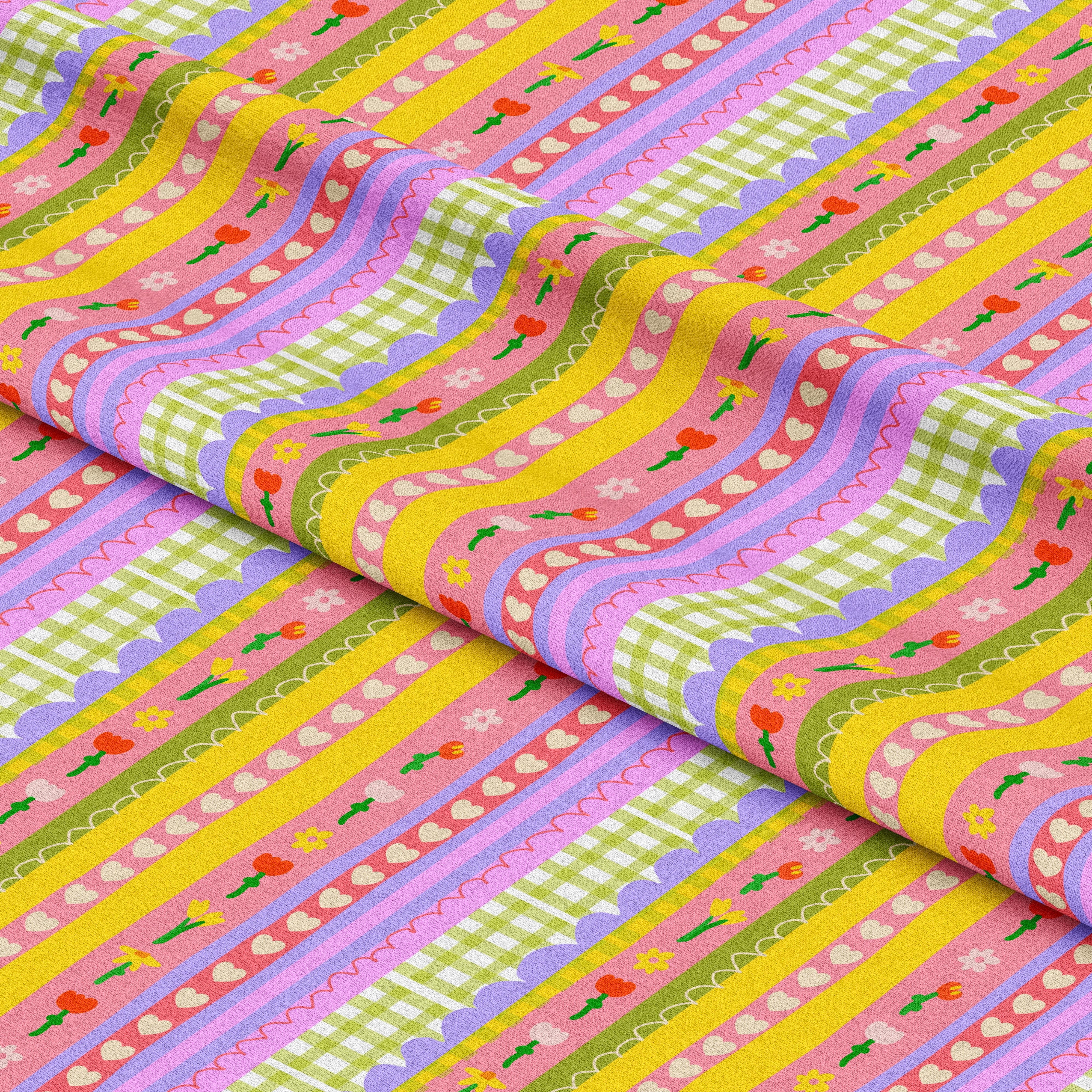 A pretty, stripy fabric with a beautiful complimentary colour palette full of sweetness and charm! Dainty, floral, picnic check vibes with stripes of bright hearts, completely lovable! Available in both Classic and Mini scales!