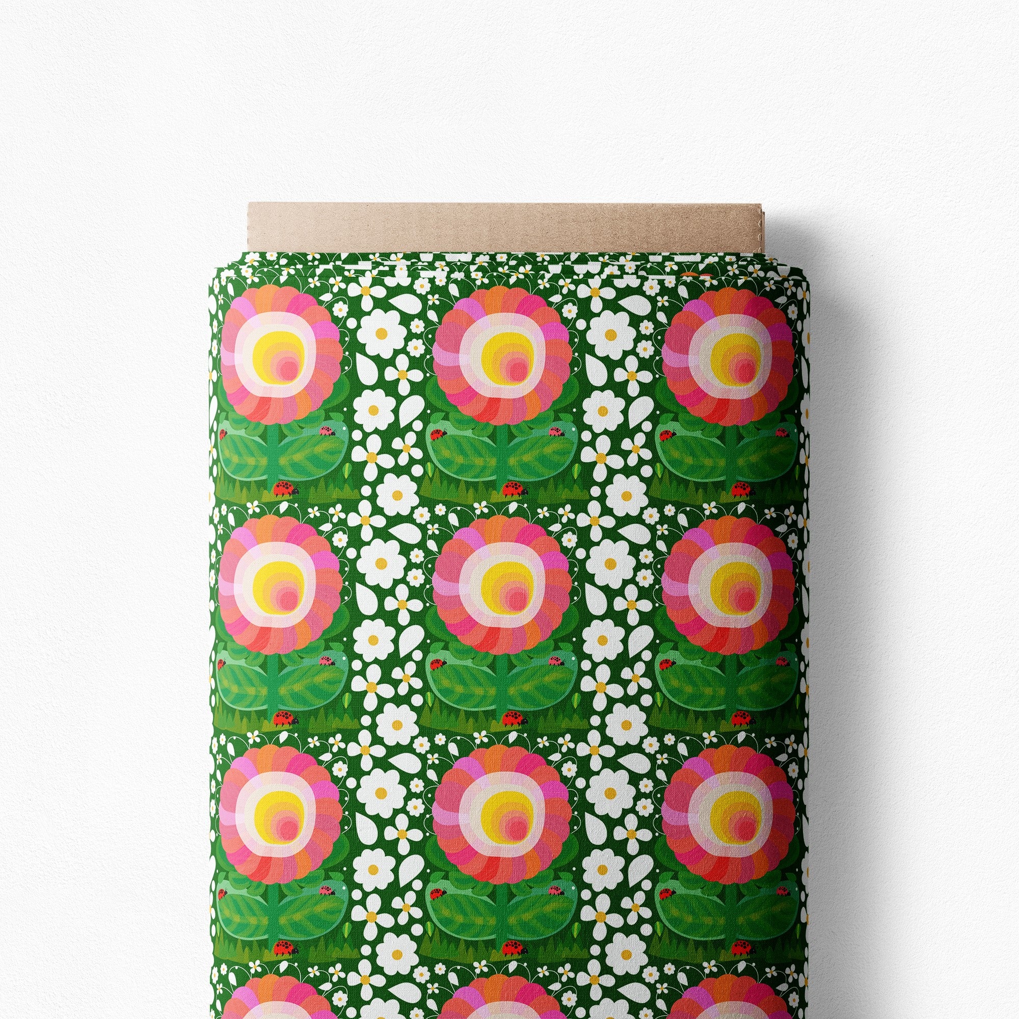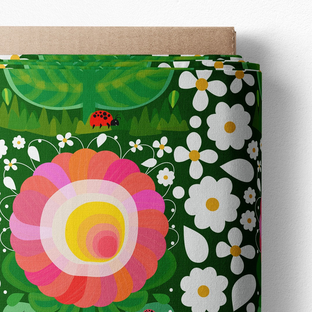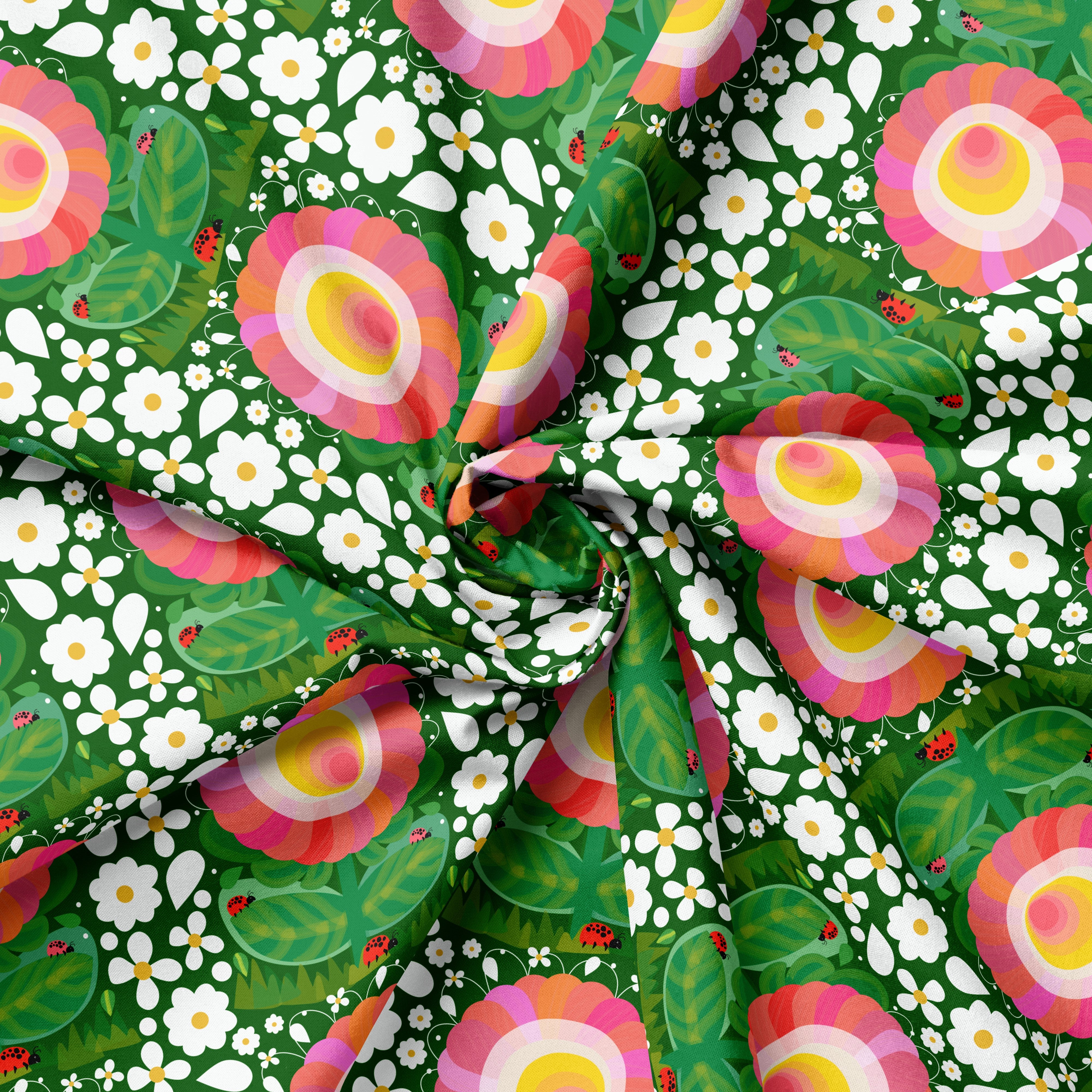 Absolutely eye-catching, in a rich forest green, this sunshine happy flower will brighten the shadiest of groves. A dainty border of white cascades on all sides. A lovable print!